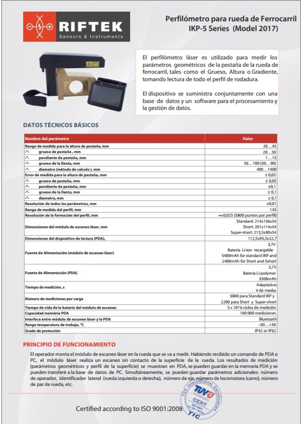 - Perfilómetro. Lectura del perfil de la banda de rodadura y obtención de parámetros como la altura (sH), el gradiente (qR) y el grueso (sD) de pestaña entre otros.