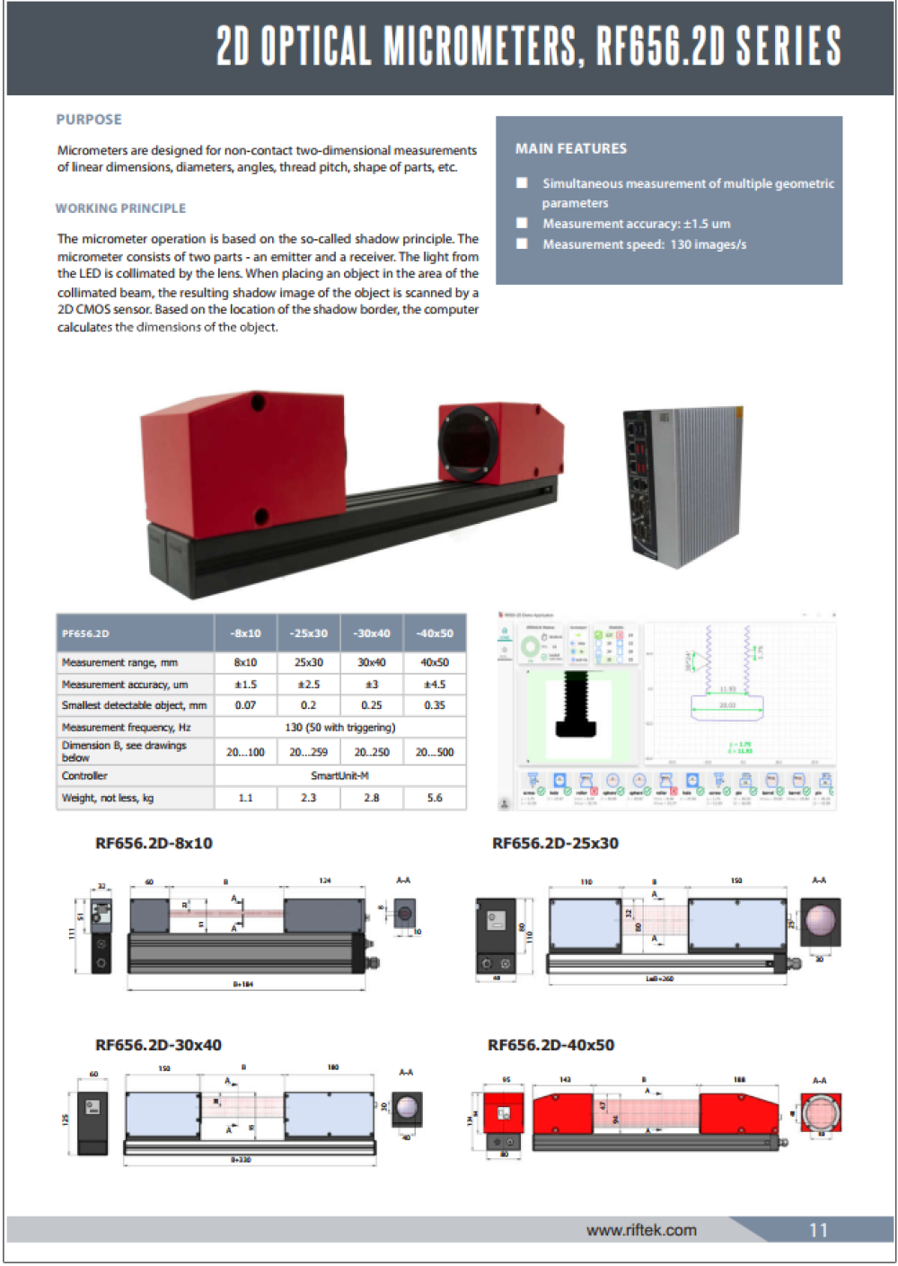 - Los micrómetros ópticos 2D están diseñados para mediciones bidimensionales sin contacto, de diámetros, ángulos, dimensiones lineales, parámetros de rosca, formas de piezas, y descentramiento entre otras.